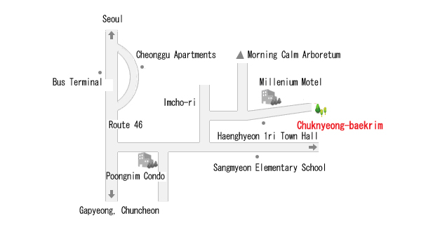 84% of Gapyeong County is mountainous and no matter where you go, you can enjoy well-forested woodlands. In particular, over 70% of the forests are composed of Korean White Pine forests making it much more grandiose. You can image how much there are since 40% of all domestically produced pine nuts are from Gapyeong County . The forest at Chuknyeongsan (Mt.) is located at the 4km marker of Route 37 (Imcho-ri) and is a forest resort that spans across a total of 4.356km 2 and consists of 30 to 50 year old Korean White Pines. At the base of the 879m above sea level Chuknyeongsan is also located the Chaejongrim Forest , which is part of Gyeonggi-do. Visitors can almost feel drunk from the scent of pine resin during the summer and the clear waters that flow in the valleys and the beautiful rocks are more than enough to take your breath away.